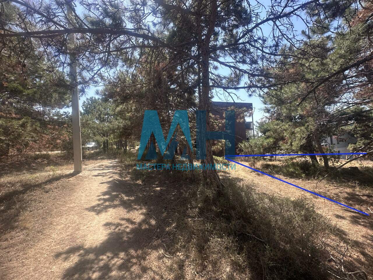Участок имеет правильную форму и придомовую территорию с соснами 🌲. По краям участка растут несколько сосен, что придает особенный уют.